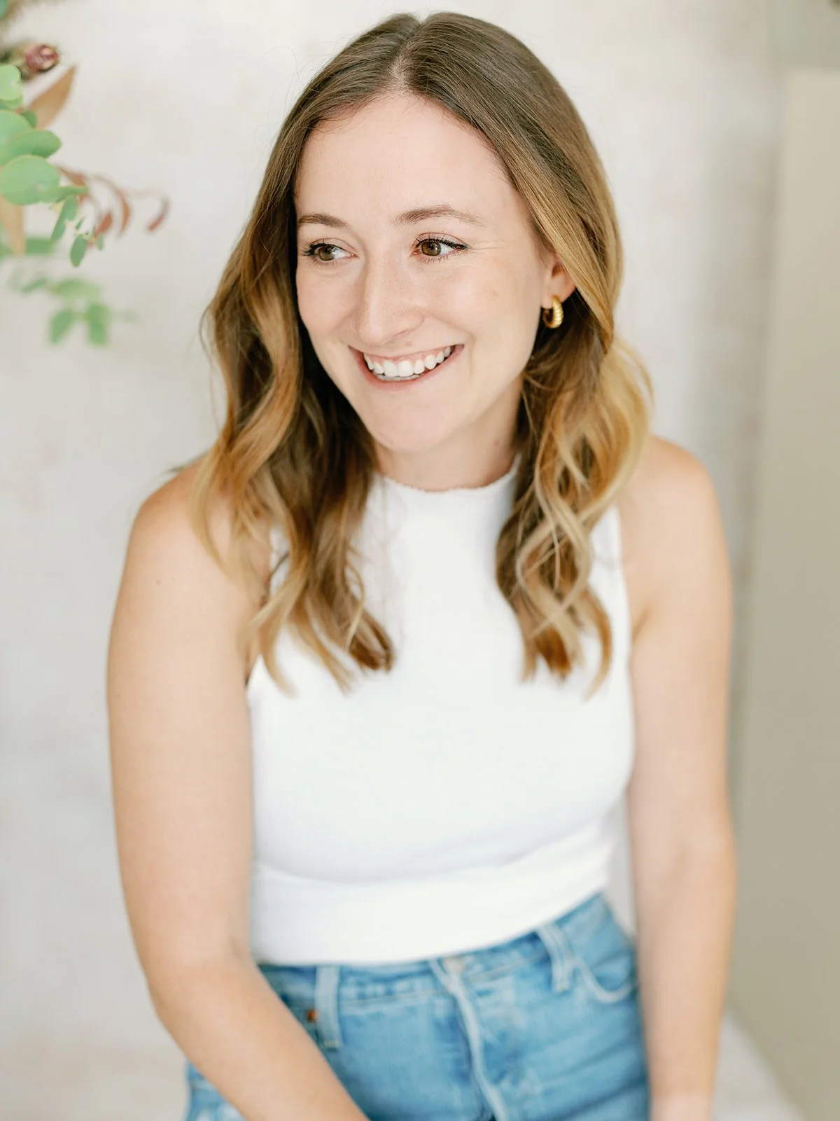 A smiling woman with long, wavy brown hair, wearing a light green plaid blazer and a white top, standing in front of a blurred background with plants.